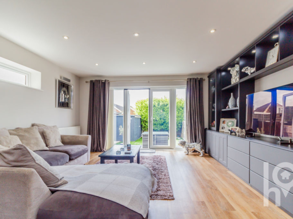 Open plan living space with engineered wood flooring and French doors to the garden