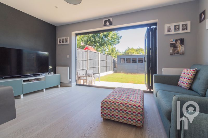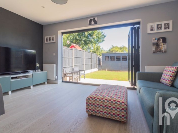 The ground floor comprises a modern kitchen with integrated appliances, a convenient WC, and a spacious lounge/diner with bi-fold doors opening onto the rear garden – perfect for entertaining and family living.