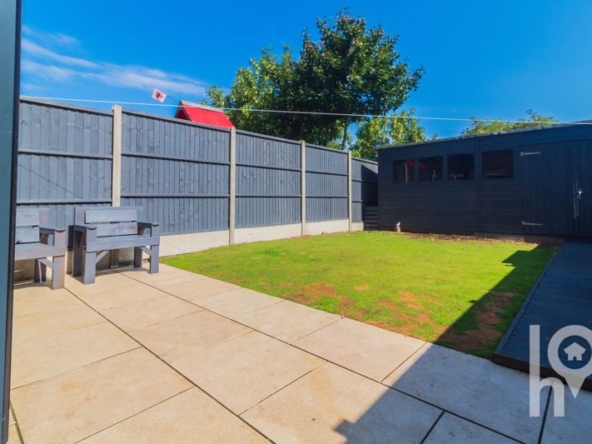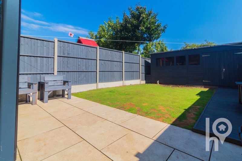 The rear garden is laid to lawn with a paved seating area and a large shed for additional storage. To the front, there is off-road parking for two cars, along with visitor bays nearby.