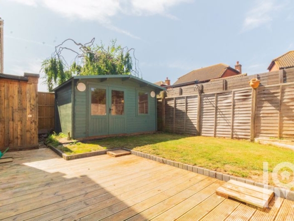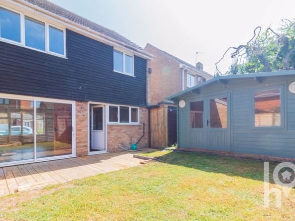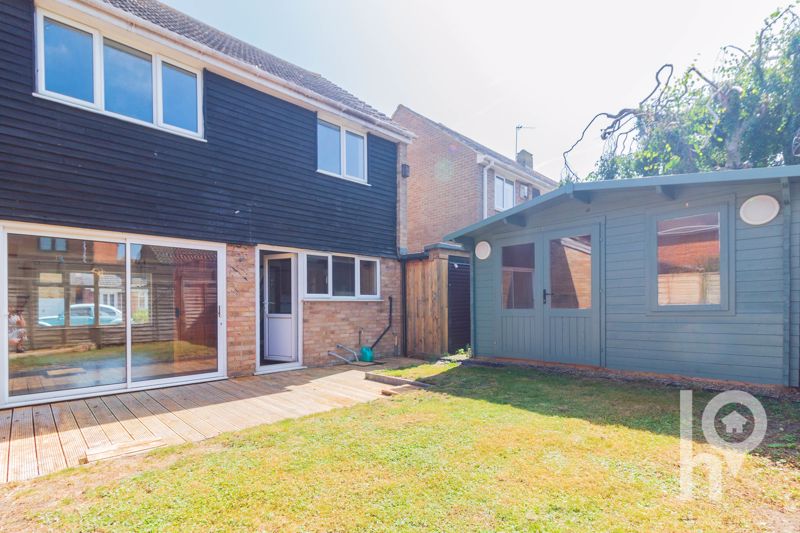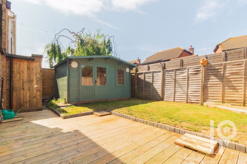 The rear garden is mainly laid to lawn, complemented by a decked seating area and a versatile cabin—previously used as a home office. To the front, the property benefits from off-road parking and access to a garage.