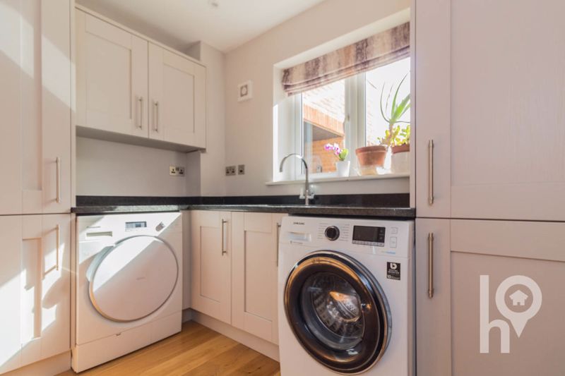 At the heart of the property is a stunning family room with sleek cabinetry, integrated appliances, and bi-fold doors opening to the garden, perfect for entertaining. A separate dining room, utility, cloakroom, and internal garage access complete the ground floor.