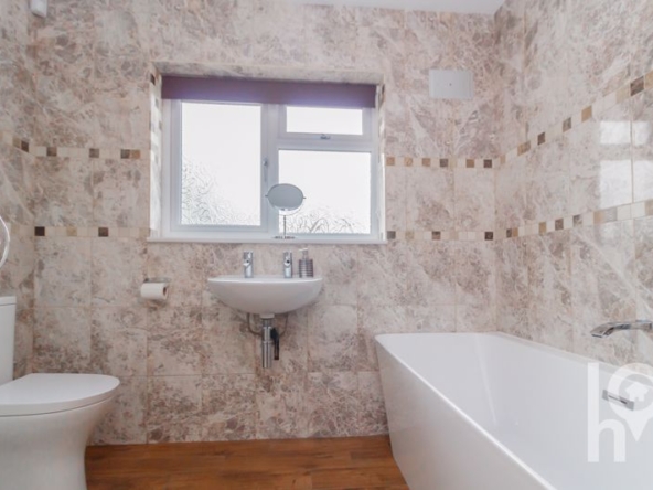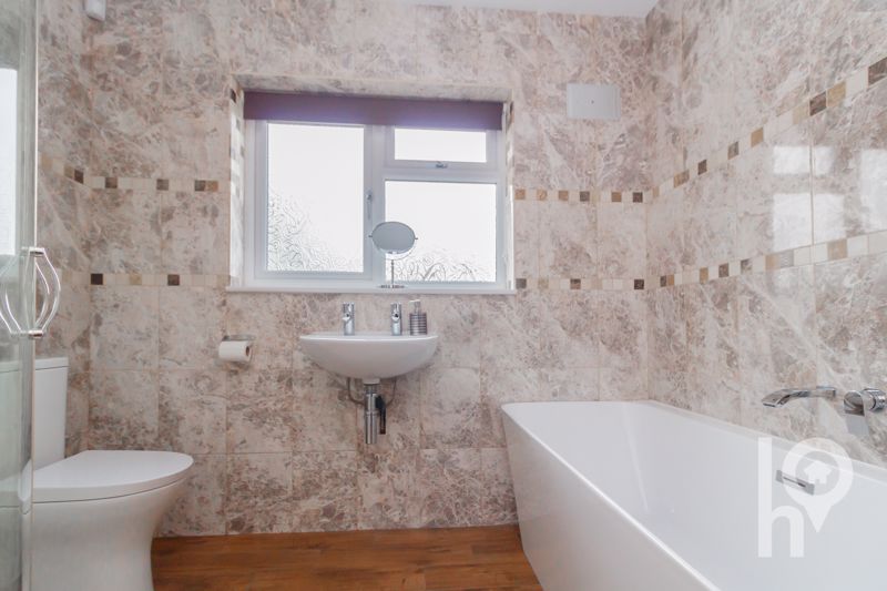 The contemporary bathroom features a full-size bath for relaxing soaks, along with WC and wash basin as well as a separate shower cubicle, all finished to a modern standard with ease of use in mind.
